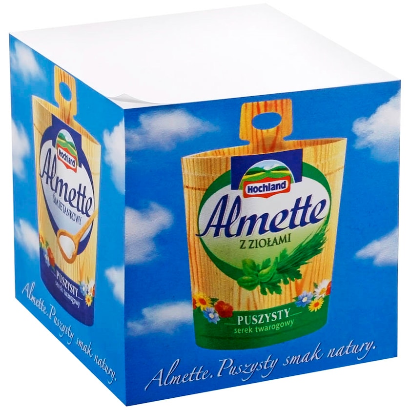Stor papperskub med 900 blad. Tryckpriset inkluderar digitaltryck på alla kubens sidor samt på alla blad. Kuben är limmad på ena sidan men de enskilda bladen har ingen klisterremsa.
