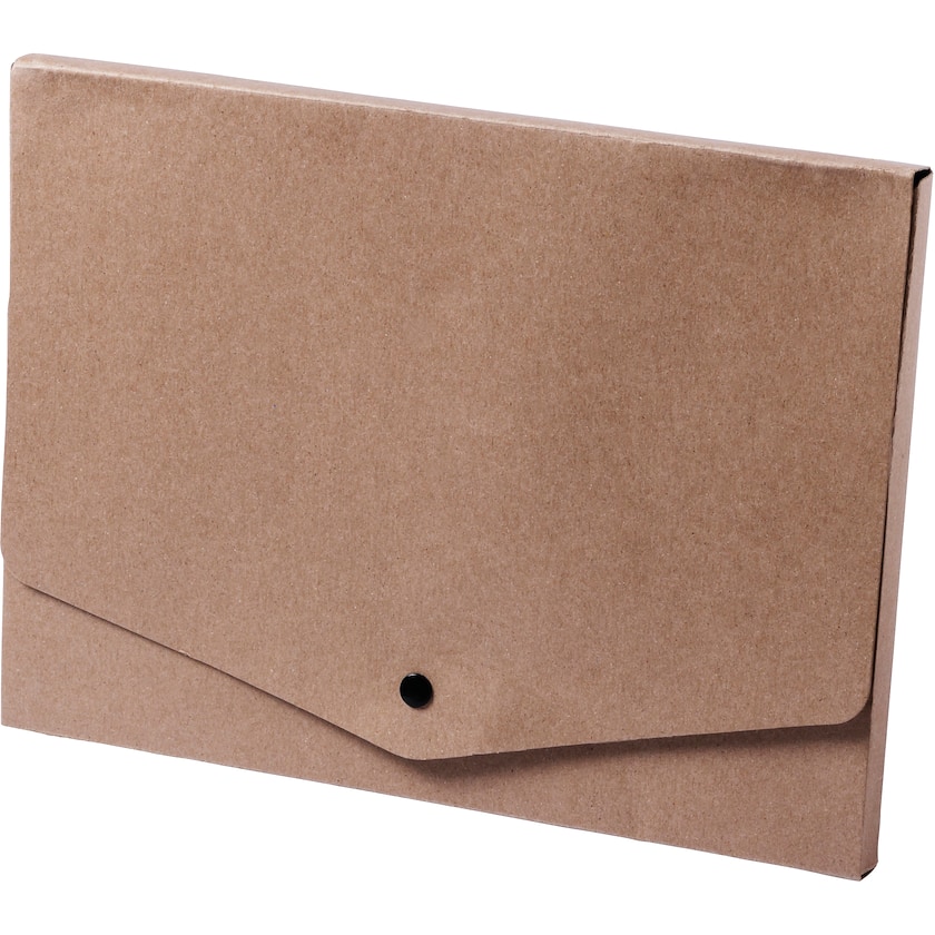 Pappersmapp av återvunnet papper. Isolde har gått om plats för dokument och locket hålls stängt med hjälp av en knapp.