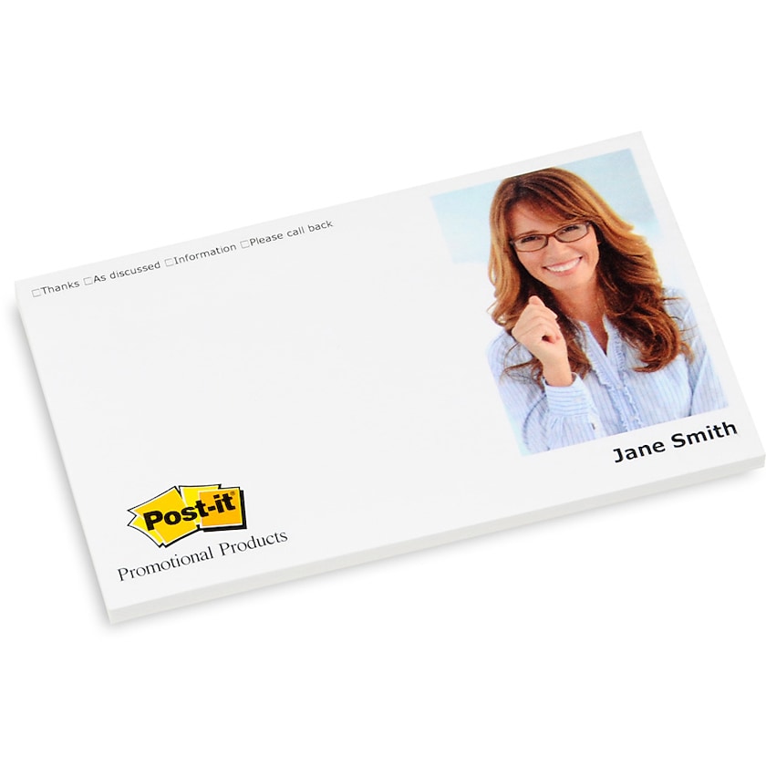 Post-it med lite större skrivyta. Försedd med ditt företags logotyp blir det en oslagbar reklambärare. Klister längs långsidan.