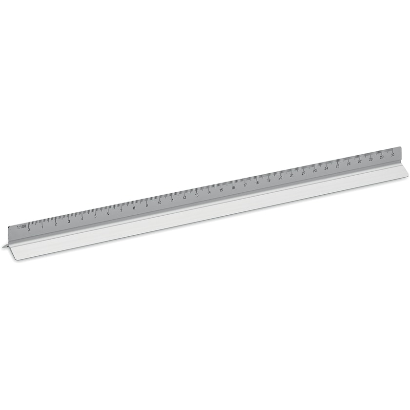 Skallinjal av aluminium med lasergravyr. Linjalen har följande skalor: 1:20, 1:25, 1:50, 1:75, 1:100.