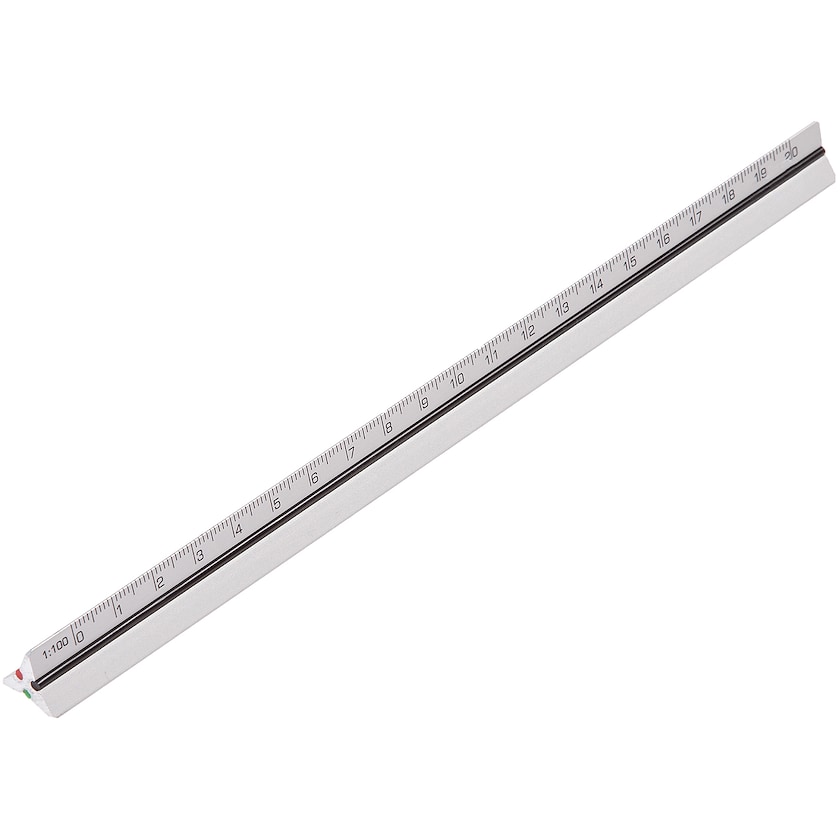 Skallinjal av aluminium för professionellt bruk. Linjalen fås med fem olika skalor efter önskemål och har tre längsgående gummisträngar i rött, grönt och svart som gör det lätt att snabbt hitta rätt skala. I detaljbilden finns valbara skalor. Skala nr 2 och 3 är populärast bland arkitekter och nr 4 är populärast bland ingenjörer. När du beställer så anger du bara vilken av skalorna nr 1-9 som önskas och vilken av de sex skalorna du önskar att ta bort.