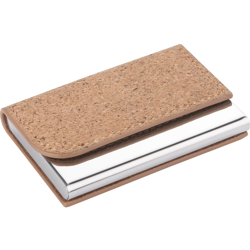 Visitkortsfodral av metall och kork. Visitkortsfodralet rymmer upp till 20 visitkort. Locket stängs med en magnet. Märkning sker med lasergravyr.