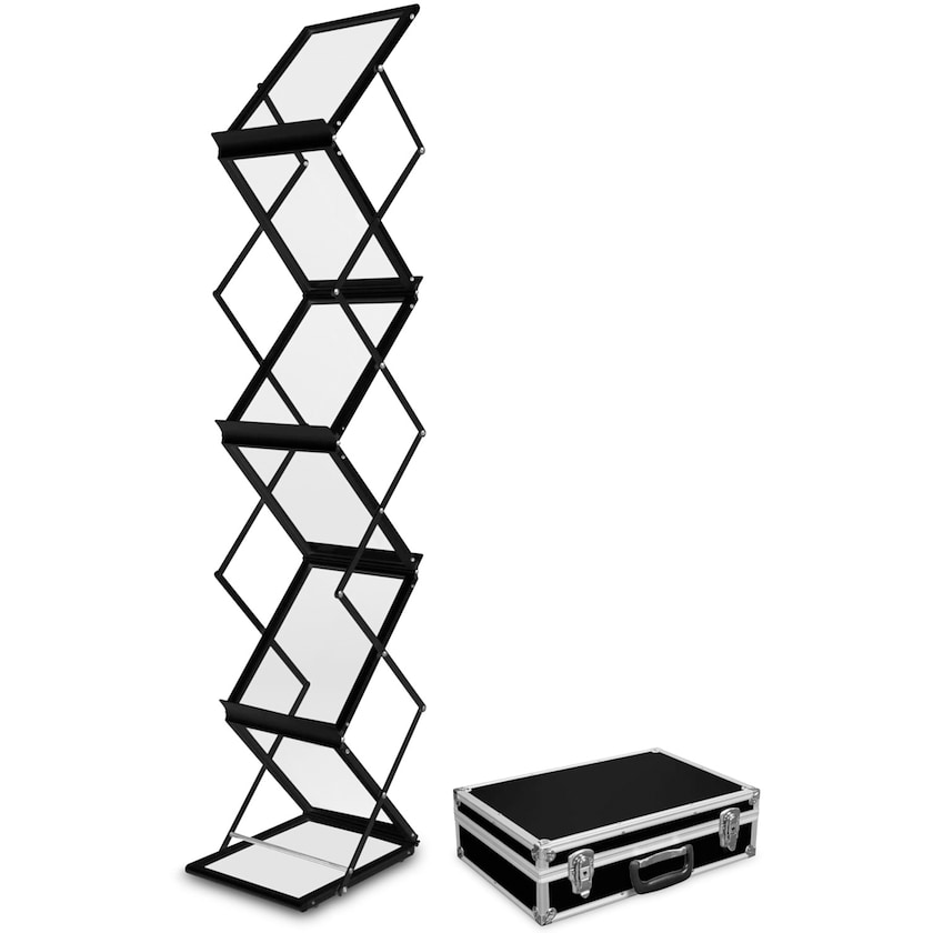 Broschyrställ Flex i nattsvart aluminium med robust väska. Broschyrstället är tillverkad av svart pulverlackad aluminium och är utrustad med 6 st broschyrfack. Varje fack mäter 30,5 x 22 cm. Uppfälld mäter broschyrstället 146 cm i höjd. Hopfälld är måtten 17 x 54 x 47 cm. Monteringen går snabbt och kräver inga verktyg. Levereras med en robust förvaringsväska av aluminium. 1 års garanti.