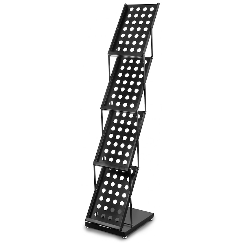 Broschyrställ för A4-broschyrer. Vista A4 är tillverkad av tålig metall och har en höjd på 124 cm när den är uppfälld. Uppfällning kräver inga verktyg. Varje broschyrfack mäter 30,5 x 22 cm. Hopfälld mäter broschyrstället 11 x 27 x 42 cm. Förvaringsväska medföljer. 1 års garanti.