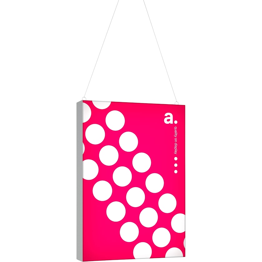 Liten ljuslåda som hängs i taket. Ljuslådan lyses upp med ett toppmodernt system av LED-lampor som garanterat lyser upp hela motivet. Motivet trycks på ett polyestertyg med en speciellt framtagen tryckmetod som säkerställer skarpa detaljer och klara färger. Motivet placeras på ljuslådans båda sidor. När det är dags att byta ut motivet så beställer du bara ett nytt tyg från oss. Montering sker snabbt och enkelt.