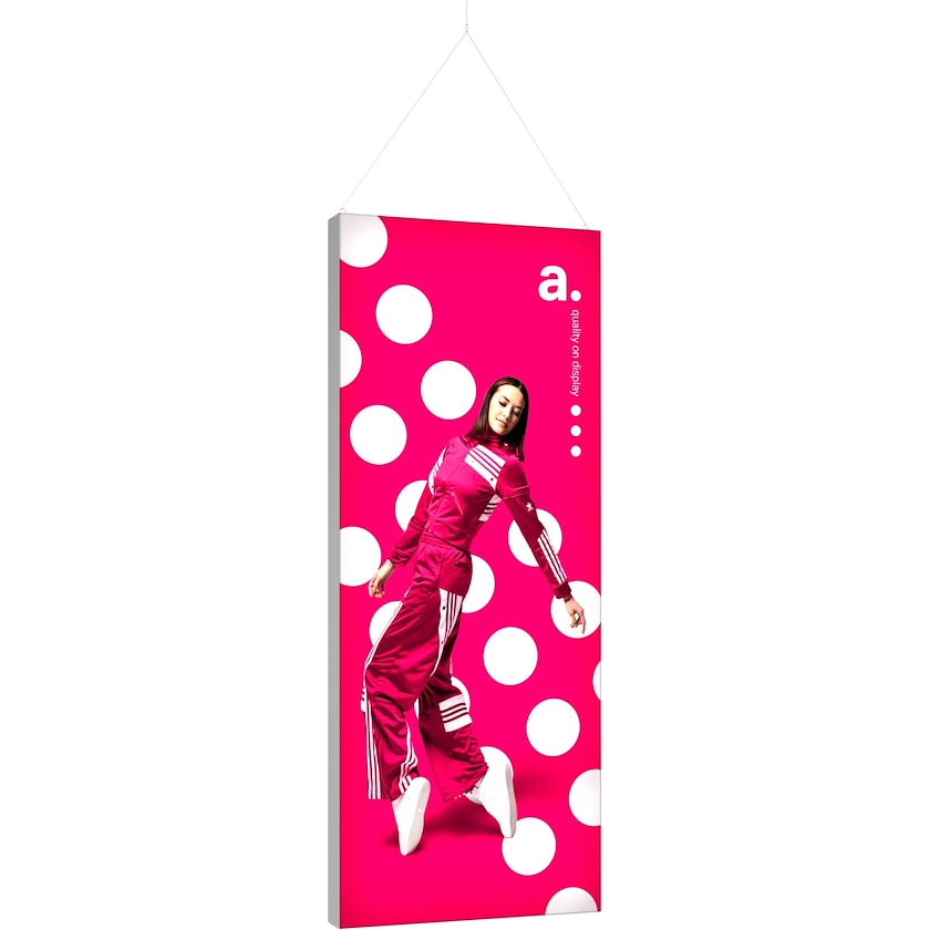 Enorm ljuslåda som man hänger från taket. Perfekt för mässan! Ljuslådan är försedd med ett toppmodernt system av LED-lampor som lyser upp hela motivet från sidorna. Ditt motiv trycks på ett polyestertyg med en speciell tryckmetod som ger skarpa detaljer och klara färger. Motivet placeras på ljuslådans båda sidor. Önskar du förnya motivet i framtiden beställer du bara ett nytt tyg från oss.