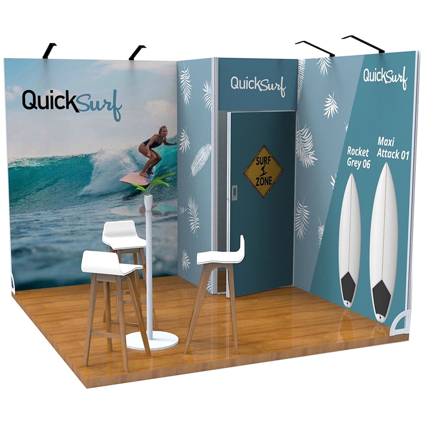 Lättmonterad mässmonter på 9 m2. Setet innehåller två 200 cm moduler, en modul med dörr, två fötter och en förvaringsväska. Trycket sker på ett tyg som sträcks över modulernas ram och fästs med silikonband. Modulernas ramar är gjorda av anodiserad aluminium. Alla delar är tydligt märkta för att möjliggöra snabb montering. Monteringen kräver inga verktyg utöver den medföljande insexnyckeln. Vill du ändra monterns tryck beställer du bara nya tyger från oss. LED-lampor och TV-stativ kan köpas som tillbehör. Bord, stolar samt golv ingår ej.