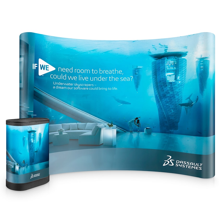 Set med mässvägg Pop Up Large, mässbord samt belysning. Mässväggen har en vackert välvd form. Montering kan göra av endast en person och kräver inga verktyg. Tyget fästs med hjälp av magnetremsor. Priset inkluderar tryck på båda mässväggen och mässbordet. Mässväggen trycks på framsidan samt på dess båda kortsidor. Mässbordet är försett med hjul och fungerar även som förvaring.