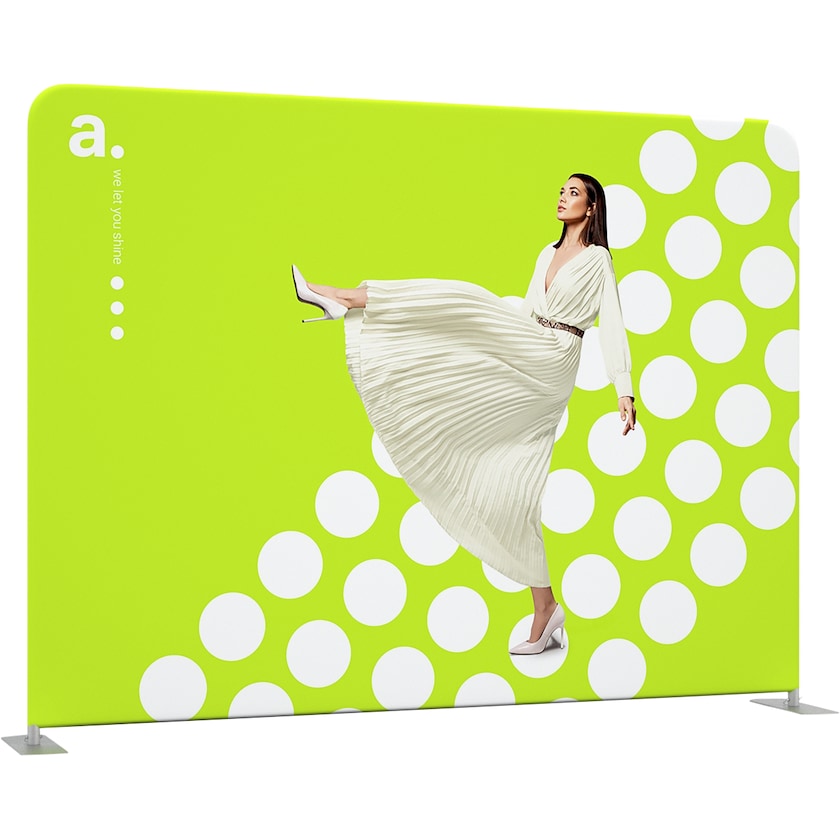 Lätt och lättmonterad mässvägg med 300 cm bredd. Mässväggen är uppbyggd av aluminiumrör som monteras ihop till en båge utan verktyg. Tyget, som vi förser med ditt tryck, kläs därefter över bågen och stängs med en dragkedja. Resultatet blir en mässvägg utan veck och rynkor. Tyget kan tvättas i tvättmaskin i 30 grader. Separata tyg kan köpas vid behov så att motiven kan bytas ut. Trycket sker med vattenbaserad färg på båda sidor.
