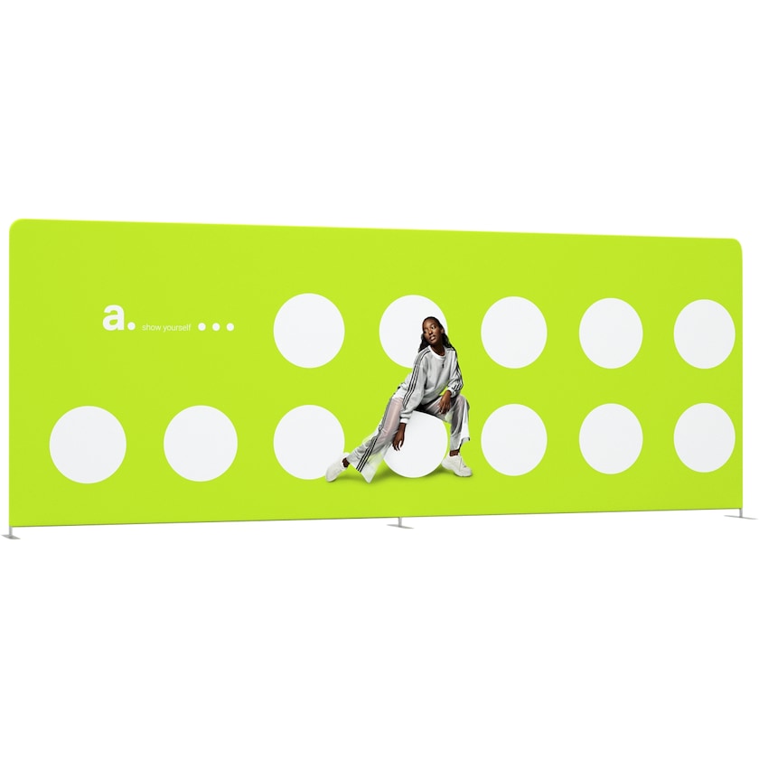 Jättelik mässvägg som är hela 600 cm bred. Mässväggen har en smart konstruktion av aluminiumrör som monteras ihop till en båge. Monteringen kräver inga verktyg och är mycket enkel. Tyget, som trycks helt efter dina instruktioner, dras därefter över bågen och försluts med hjälp av en dragkedja. Resultatet blir en skrynkelfri mässvägg utan veck. Tyget trycks med miljövänlig vattenbaserad färg på både fram och baksidan. Tyget klarar tvätt i tvättmaskin i 30 graders temperatur. Om du senare vill byta ut motivet på mässväggen beställer du bara ett nytt tyg med tryck från oss.