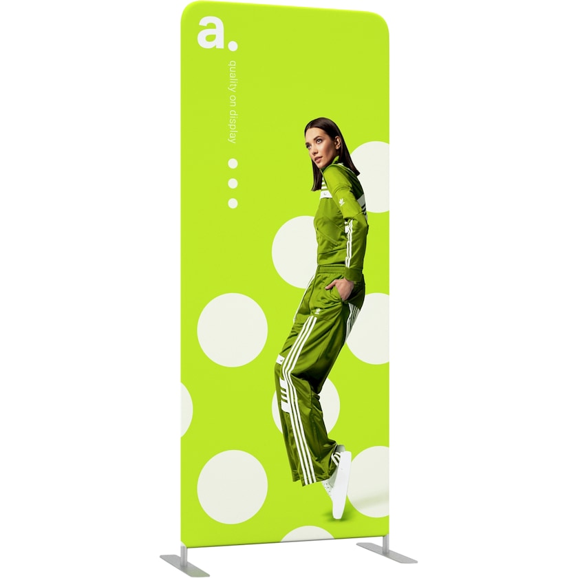 Mässvägg med en bredd på endast 90 cm. Ett modernt alternativ till en rollup! Mässväggen består av aluminiumrör som klickas ihop och bildar en båge. Monteringen går blixtsnabbt och kräver inga verktyg. När bågen är färdigmonterad drar du tyget över den och försluter den med en dragkedja. Tyget trycks med miljövänlig vattenbaserad färg på fram fram- och baksidan. Tyget kan vid behov tvättas i tvättmaskin i 30 grader. Vill du någon gång byta motiv så beställer du bara ett nytt tyg av oss. Miljövänligt och smart.