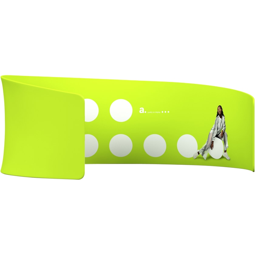 Stor rundad vägg med hela 650 cm bredd. Den runda formen skapar en trevlig rumsliknande yta. Tack vare en smart konstruktion av aluminiumrör som klickar i varandra, kan mässväggen monteras helt utan verktyg. Efter att du monterat ihop aluminiumrören till en båge drar du bara tyget över bågen och försluter med en dragkedja. Tyget trycks med miljövänlig vattenbaserad färg på fram- och baksidan. Tyget klarar maskintvätt i 30 grader. Vill du någon gång byta motiv beställer du bara ett nytt tyg.