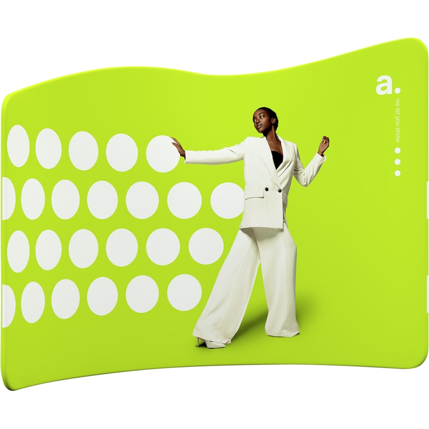 Mjukt vågformad montervägg med 300 cm bredd. Den mjuka formen skapar en vacker mässvägg för ditt event. Mässväggen är uppbyggd av aluminiumrör som sätts ihop till en båge. Delarna sätts ihop helt utan verktyg. Tyget med ditt tryck, trär du över bågen och försluter med en dragkedja. Trycket görs helt miljövänligt med vattenbaserad färg på fram- och baksidan. Behöver du någon gång tvätta tyget kan du köra det i tvättmaskin i 30 grader. Vill du ha fler motiv? Beställd då bara ytterligare ett tyg av oss. En praktisk förvaringsväska medföljer.