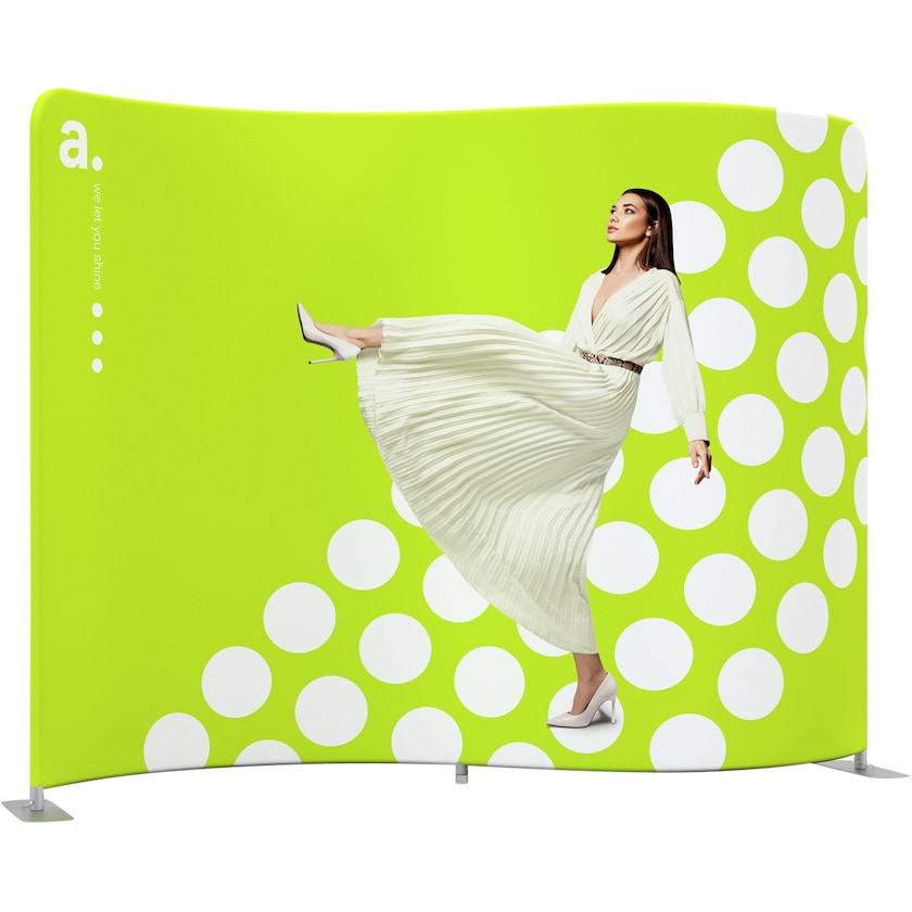 300 cm bred mässvägg med spännande serpentinform. En mässvägg som skapar uppmärksamhet bara genom sin form! Mässväggen har en mjukt böljande form med en konstruktion av aluminiumrör som sätts ihop till en båge. Monteringen av bågen kräver inga verktyg. Tyget, som vi trycker helt efter dina instruktioner, trär du över bågen och försluter med en dragkedja. Svårare än så är det inte! Tyget trycks med vattenbaserad färg på båda sidorna. Vid behov kan tyget tvättas i tvättmaskin i 30 grader. Om du i framtiden vill förnya motivet så beställer du helt enkelt bara ett nytt tyg med tryck hos oss.
