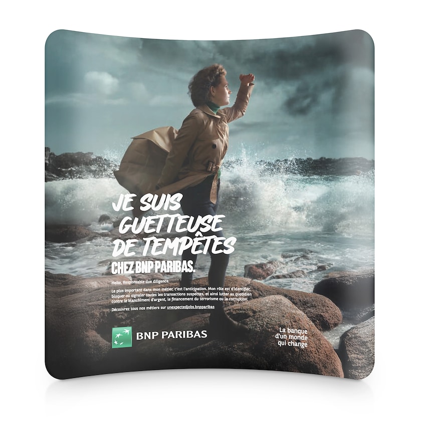 Svängd mässvägg av typen softwall. Softwall Small består av en rörram med aluminiumsektioner som enkelt sätts ihop till en mjukt formad mässvägg. Tyget träs över rörramen vilket ger en mässvägg med mjuk form och oslagbar tryckkvalitet. Monteringen går snabbt och kräver inga verktyg. Fördelen med detta system är att man lätt kan byta ut motivet genom att byta tyg. Tryckpriset avser tryck på framsidan. Levereras i en praktisk väska. 5 års garanti på aluminiumkonstruktionen.