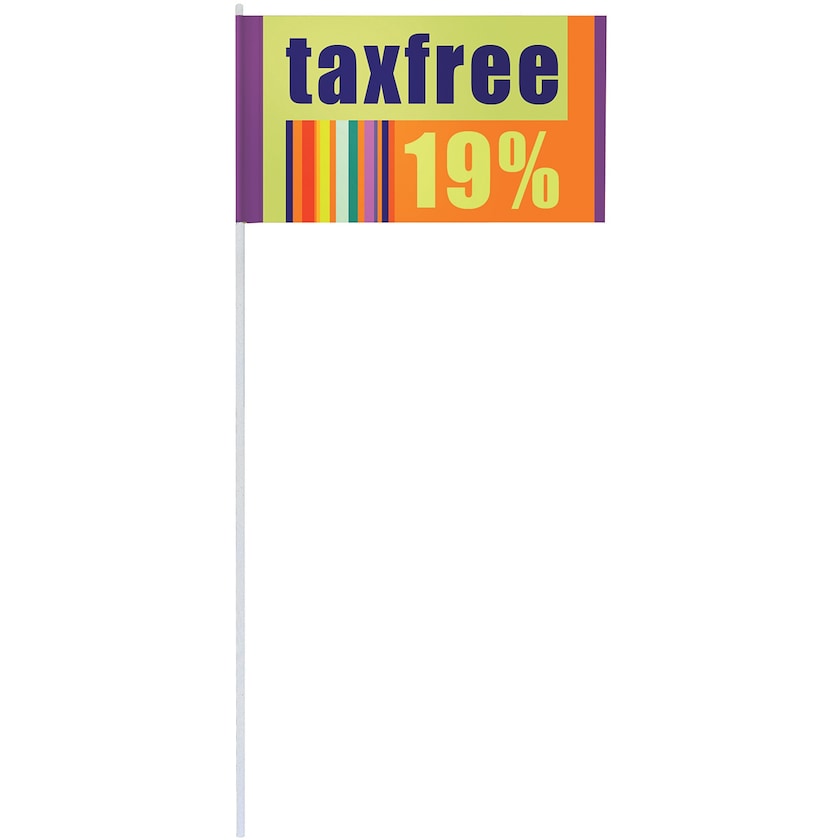 Pappersflagga med reklamtryck. Flaggan är tillverkad av 100 g/ m² mattlaminerat papper av offsetkvalitet. Flaggan är fäst på en ca 40 cm lång plastpinne som är tillverkad av 70% återvunnet material. Trycket sker på båda sidor och de båda sidorna kan ha olika motiv. Levereras buntade om 50 st i lådor om 1000 st.
