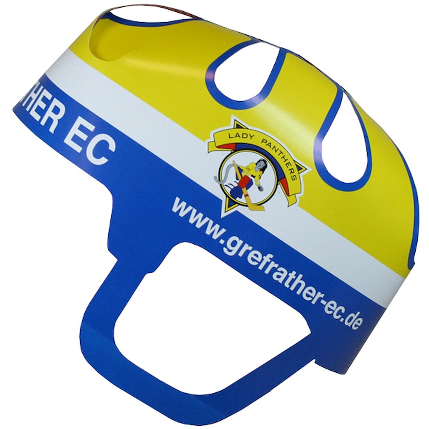 Hockeyhjälm av papper. Insidan är vit och utsidan trycks helt efter önskemål. Levereras omonterade. En kul supporterprodukt!