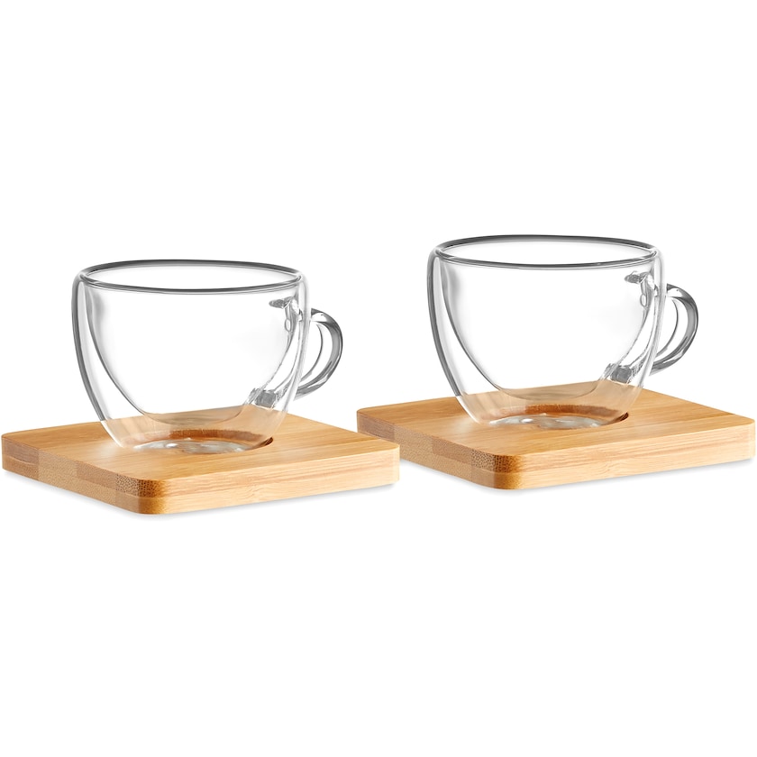 Set med två espressoglas med underlägg av bambu. Glasen rymmer vardera 9 cl. Levereras i en snygg presentförpackning. Tryckpriset avser antingen tryck på presentförpackningens pappersbanderoll eller på ett av underläggen.