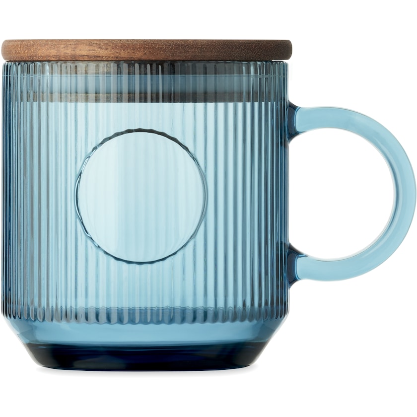 Vackert ribbad glasmugg med trälock. Trycket sker på den släta cirkelformade ytan på muggens framsida. Trälocket är gjort av akaciaträ och är FSC-certifierat.