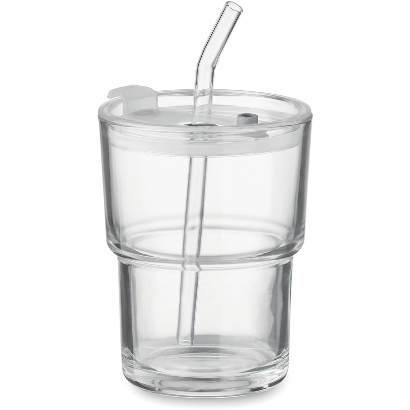 Glasmugg med lock och sugrör. Sugröret är tillverkat av glas. Locket är läckagefritt och har en dricköppning. Tål maskindisk och mikrovågsugn.