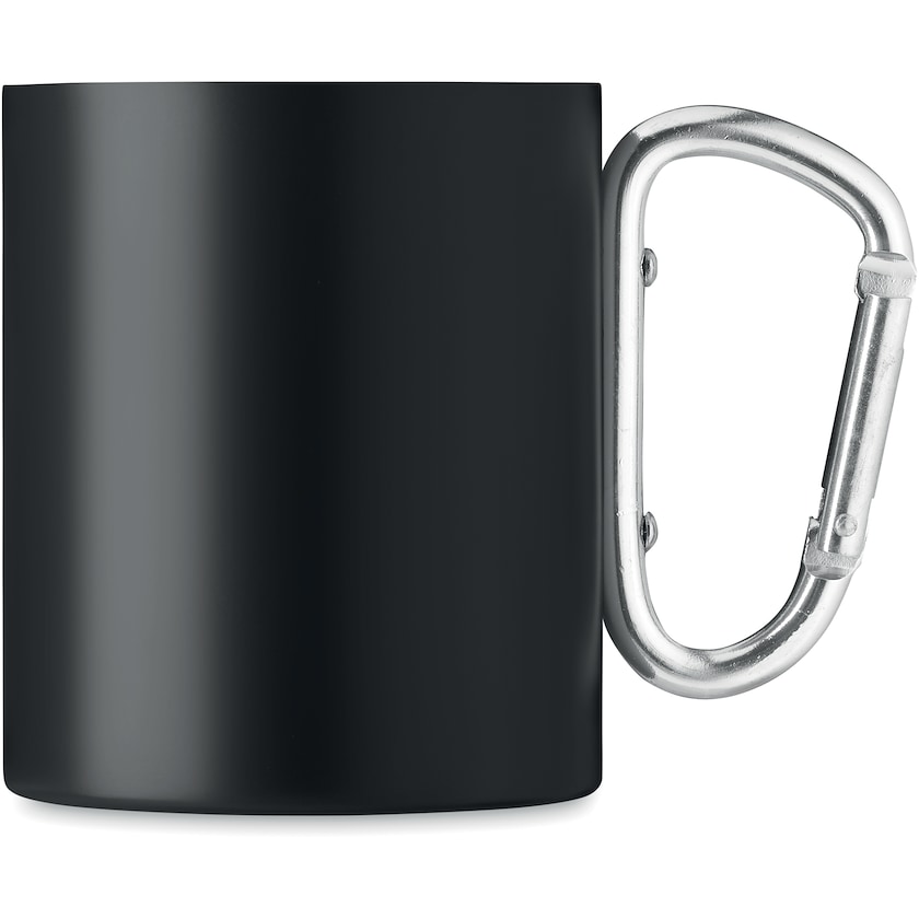 Mugg av rostfritt stål med karbinhake som handtag. Muggen har dubbla väggar vilket gör att varm dryck hålls varm längre.