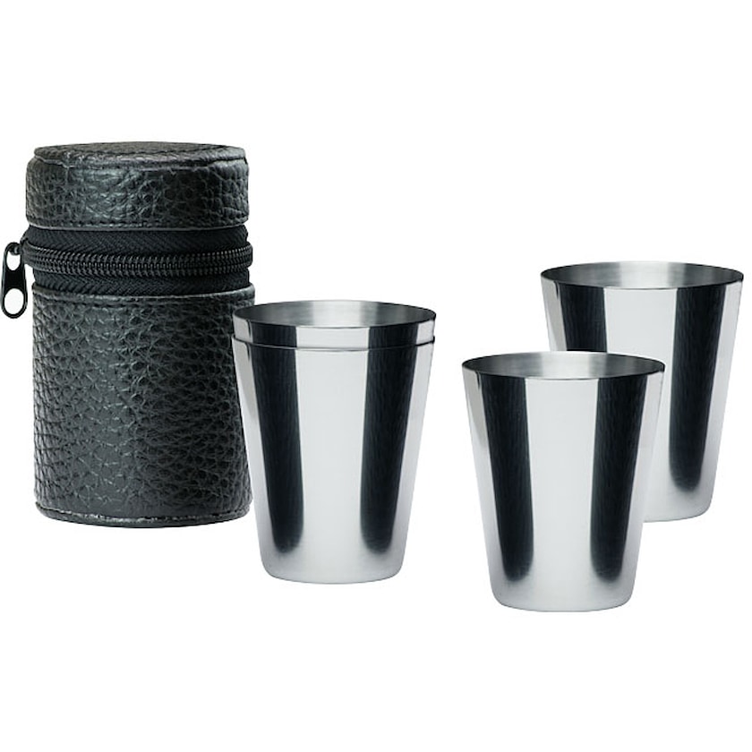 Fyra metallmuggar i rostfritt stål som levereras i fodral av konstläder. Lasergravyrpriserna omfattar lasergravyr på alla fyra muggar.