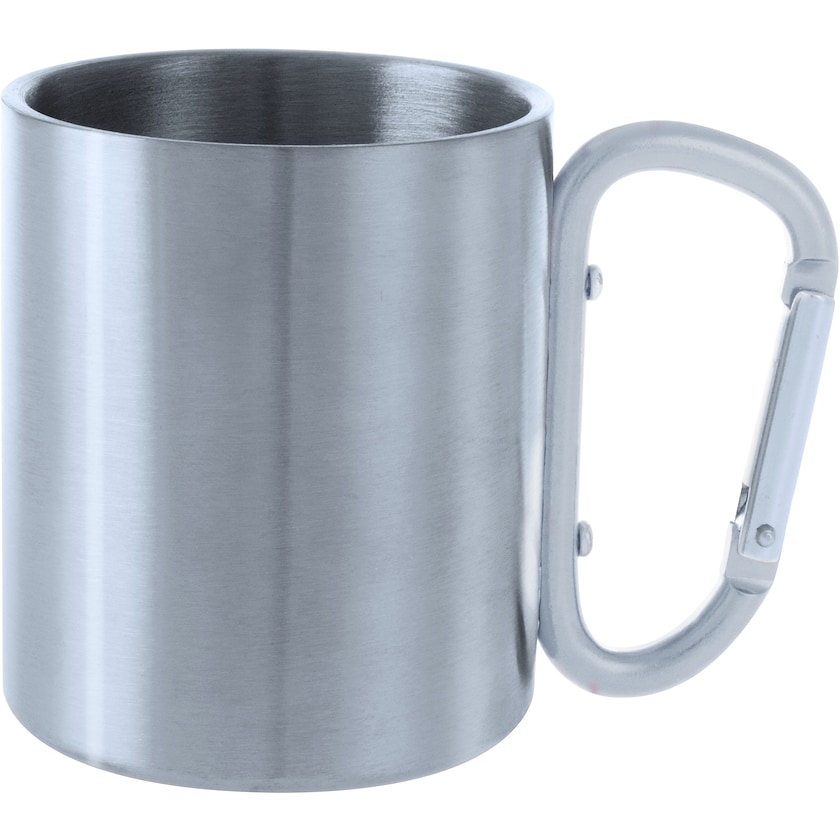 Metallmugg av rostfritt stål med karbinhake. Muggen rymmer 20 cl och är perfekt att ha fäst på ryggsäcken när man är ute i naturen. Levereras i en presentlåda.