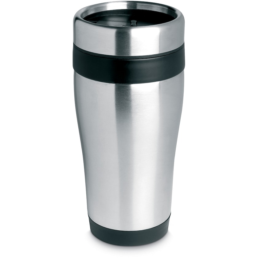 Dubbelsidig metallmugg utan handtag. Muggen insida är tillverkad av polypropen. En snygg och prisvärd metallmugg!