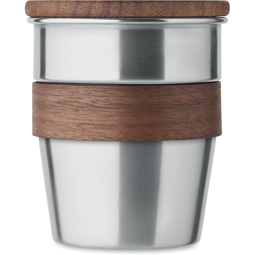 Exklusiv mugg av återvunnet rostfritt stål och valnöt. Muggen har enkel vägg och är tillverkad av 90% återvunnet rostfritt stål och 10% vanligt rostfritt stål. Greppet bör tas bort vid diskning. Eftersom muggen har enkel vägg kan värmeöverföring förekomma vid het dryck.