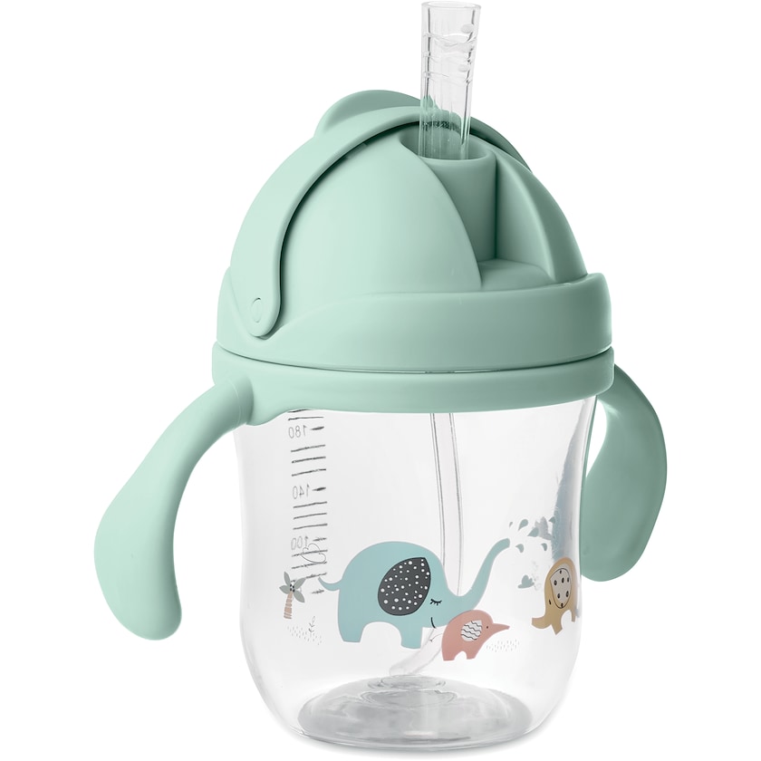 Babymugg med tryck. Muggen har ett praktiskt lock med uppfällbart sugrör. Tillverkad av tritan.