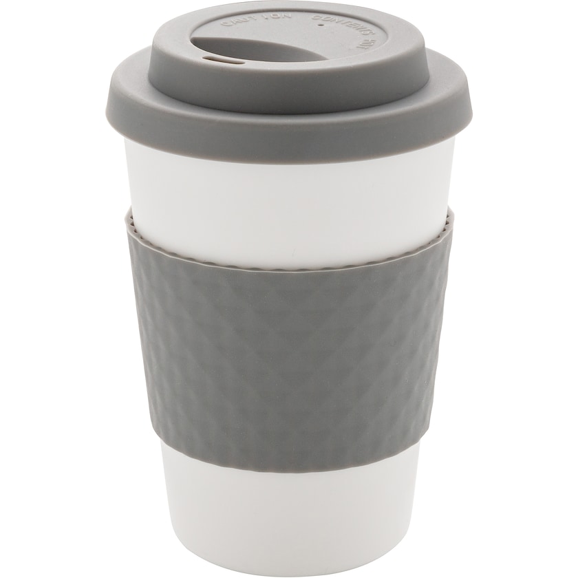 Take-away-mugg med grepp och lock av silikon. Muggen rymmer 27 cl. Muggen går bra att använda i diskmaskin och mikrovågsugn. Passar de flesta kaffeautomater.