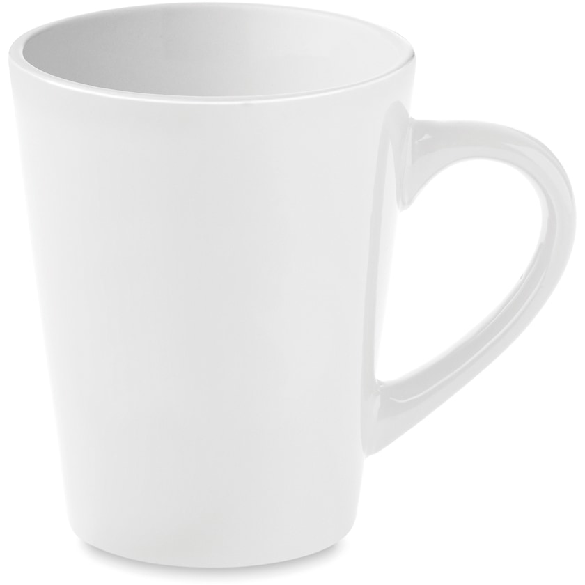 Mugg med mycket stor tryckyta. Tryck är även möjligt på muggens insida och tryckytan är då 120 x 20 mm. Muggen levereras individuellt förpackad i en vit kartong.
