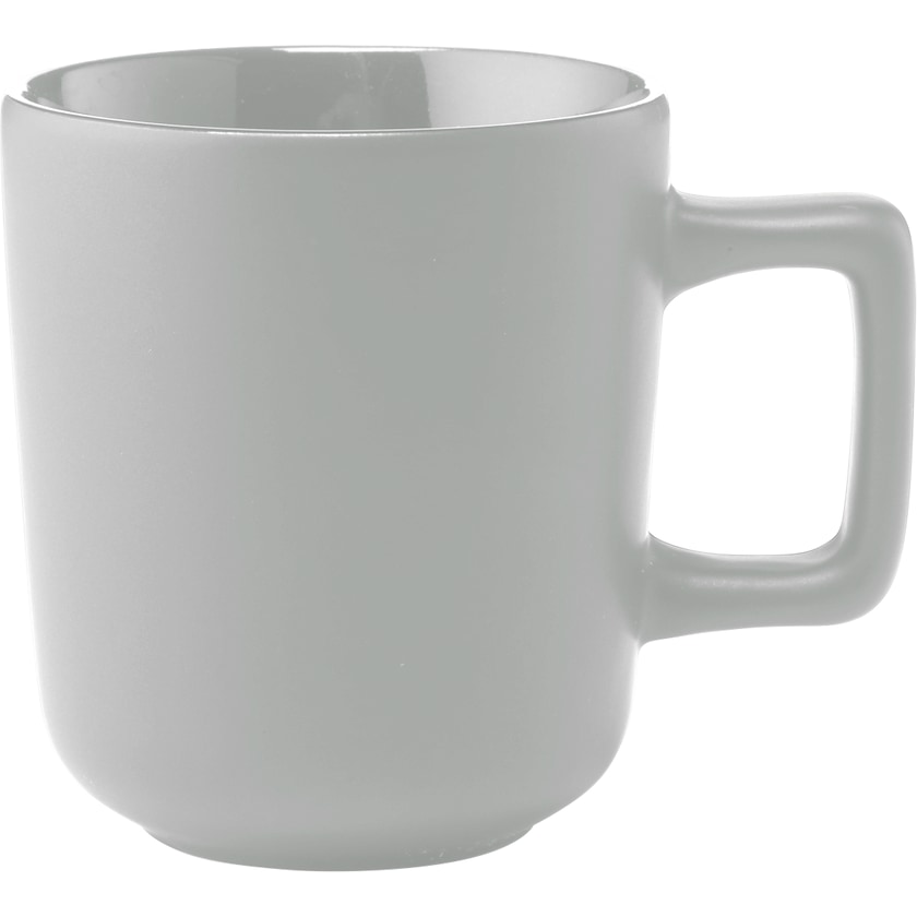 Karaktäristisk mugg med effektfullt handtag. Utsidan är matt och insidan är blank. Muggen samt trycket tål maskindisk. Trycket är certifierat enligt EN 12875-2.