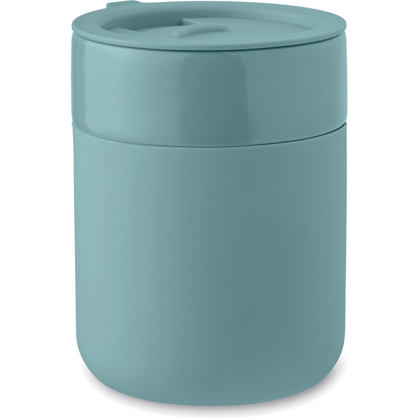 Stengodsmugg med silikonyta och lock. En smart mugg som tack vare locket håller drycken varm längre.