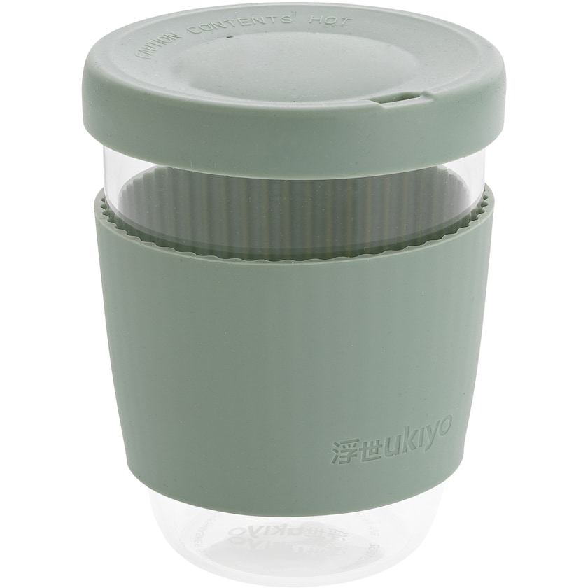 Takeaway-mugg av glas från Ukiyo. Greppet och locket är tillverkat av silikon. Locket har en liten öppning så att ånga kan försvinna. Glaset är av typen borosilikat, vilket innebär att det är eldfast och mycket tåligt.