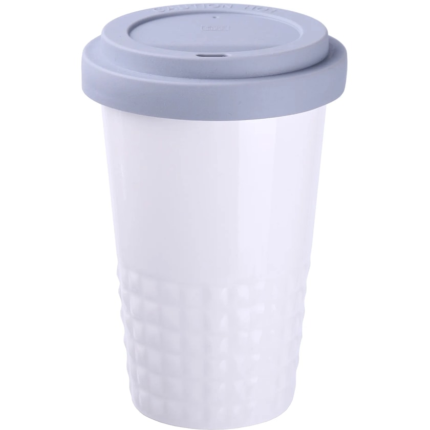 Väldesignad take away-mugg av porslin med lock av gummi. Muggens botten har en karaktäristiskt mönster som är skönt att greppa om. Tack vare dubbla väggar hålls sin dryck varm länge.