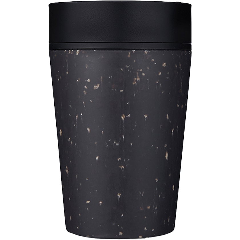 Liten take away-mugg av återvunnet material. Muggen har dubbla väggar. Det yttre isolerande skiktet är tillverkat av begagnade återvunna kaffekoppar av papper av engångstyp. Innerväggen och locket är av polypropen. 100% läckagefri. Locket har en patenterad utformning som gör att du kan dricka från vilket håll du vill. Locket kan öppnas och stängas med en hand. Tillverkad i Europa. Vid tryck i maximalt två färger är tryckytan 80 x 25 mm.