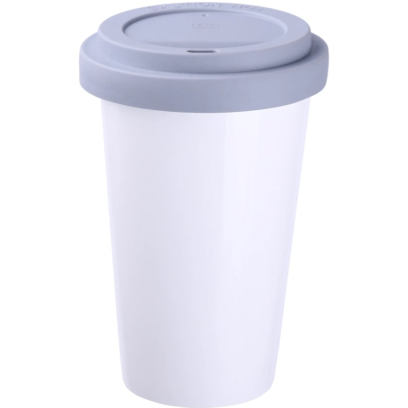 Take away-mugg av porslin med gummilock. Muggen har dubbla väggar vilket gör att drycken hålls varm länge.