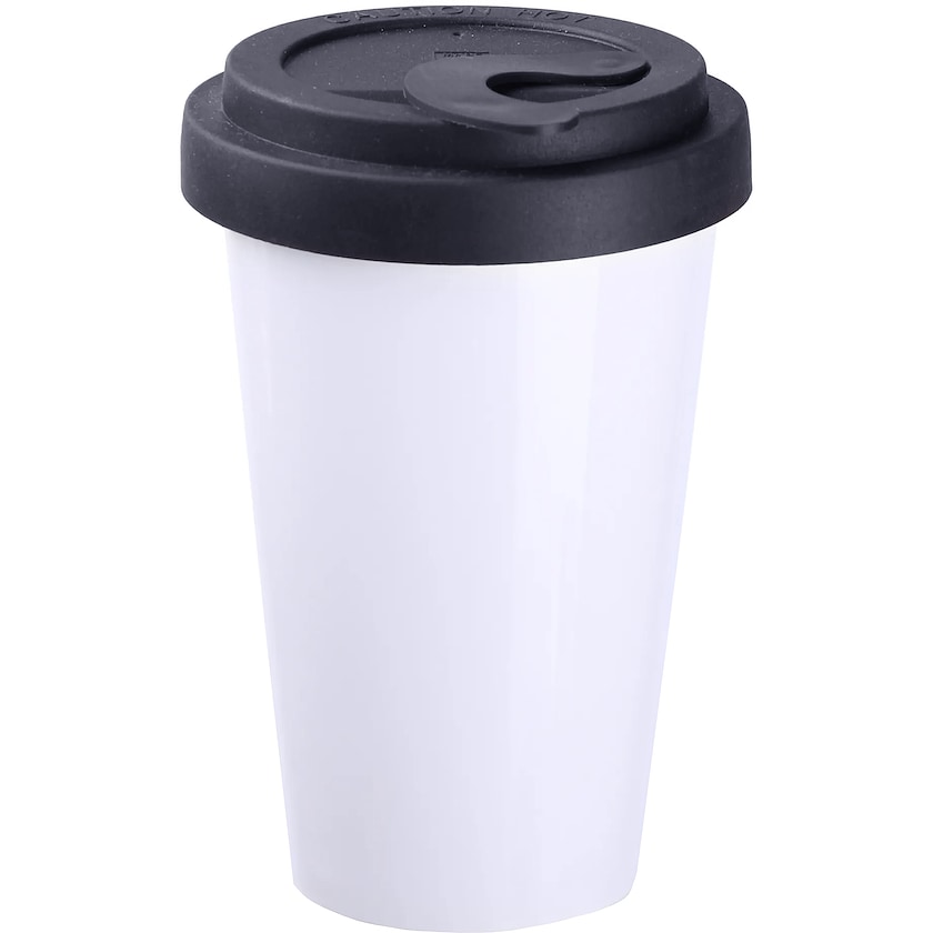Take away-mugg av porslin med unikt gummilock med spillskydd. Muggen har dubbla väggar vilket gör att din dryck hålls varm under lång tid.