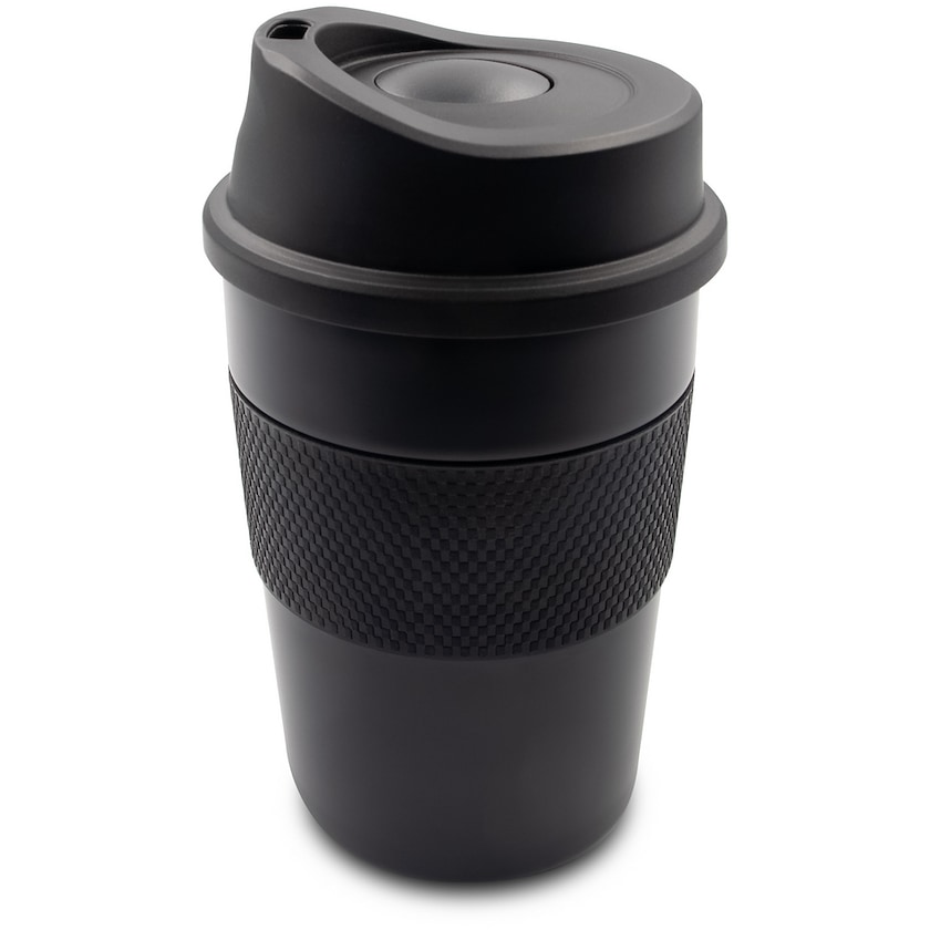 Termosmugg av rostfritt stål. Muggen har vakuumisolerade väggar, insida och utsida av rostfritt stål och ett plastlock med ett smidigt drickhåll som kan öppnas och stängas. Runt muggen finns ett bekvämt gummigrepp.