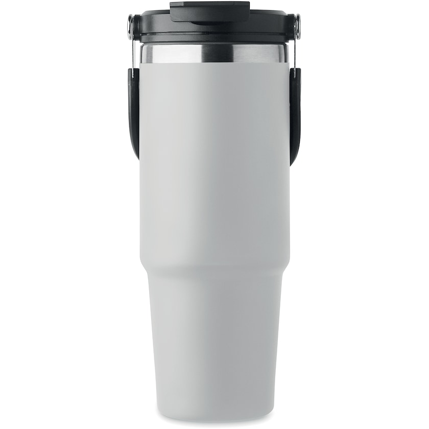Stort termosmugg med bärhandtag. Mirabelle har dubbla väggar och är tillverkad av 90% återvunnet rostfritt stål och 10% vanligt rostfritt stål. Locket har ett inre sugrör, vikbart munstycke och dricksöppning.