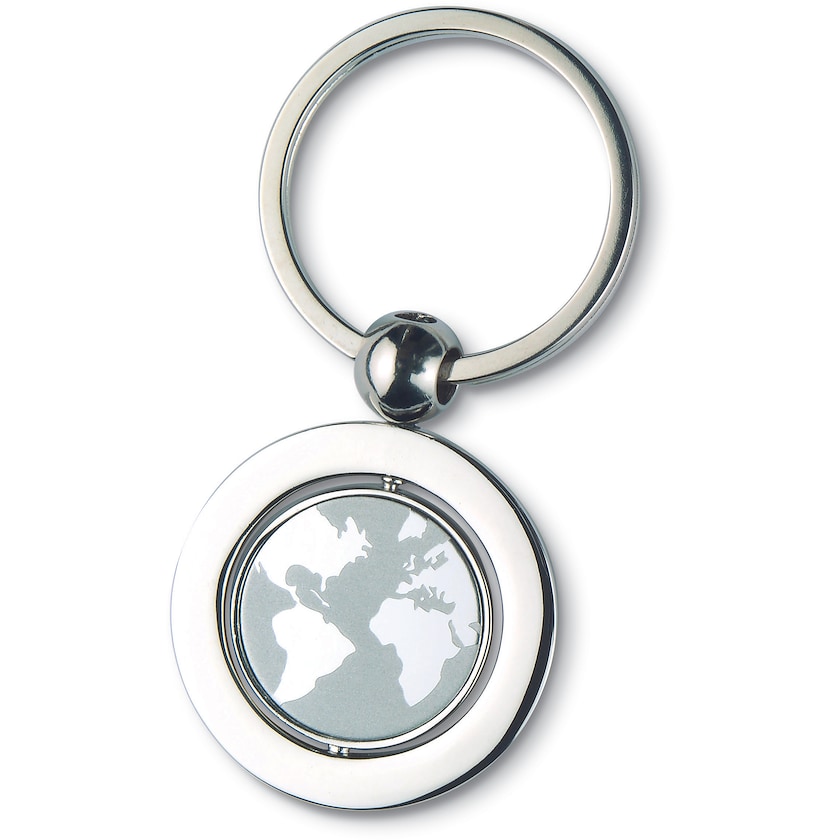 Elegant nyckelring av metall dekorerad med en världskarta. Nyckelringen levereras i en svart presentask.