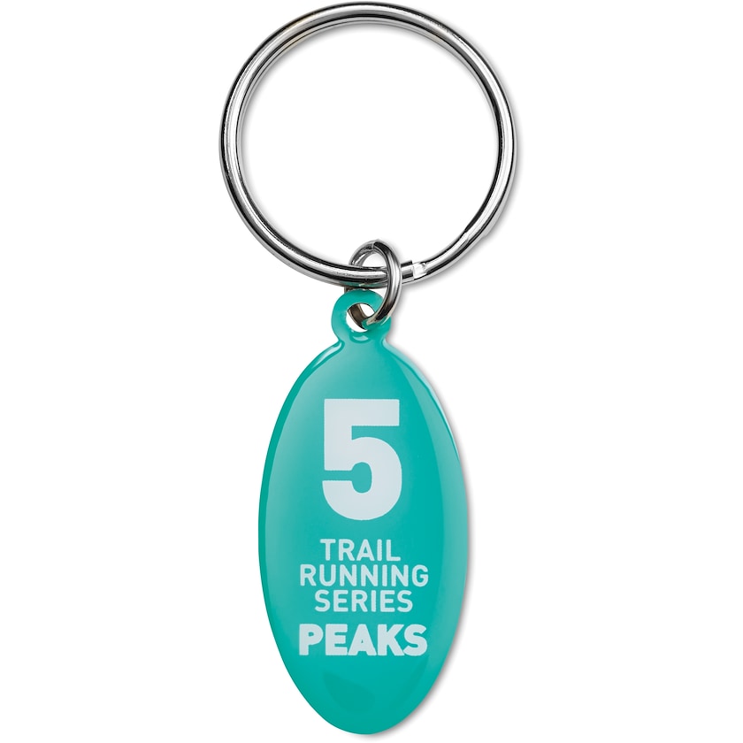 Nyckelring med tryck under ett skyddande lager av epoxy. Nyckelringens baksida är av rostfritt stål. Maximal storlek är 55 x 35 mm (exklusive sprängringen). Som tillval för 2,50 kr/st kan nyckelringen fästas på ett kort av 300 grams papper. Kortet trycks med digitaltryck på båda sidor och får vara maximalt 12 x 6 cm.