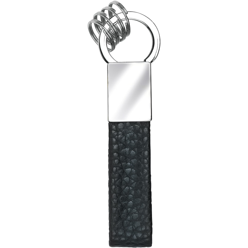 Nyckelring av metall och konstläder. Nyckelringen är försedd med flera mindre ringar. Märkning kan antingen ske med tryck eller lasergravyr.