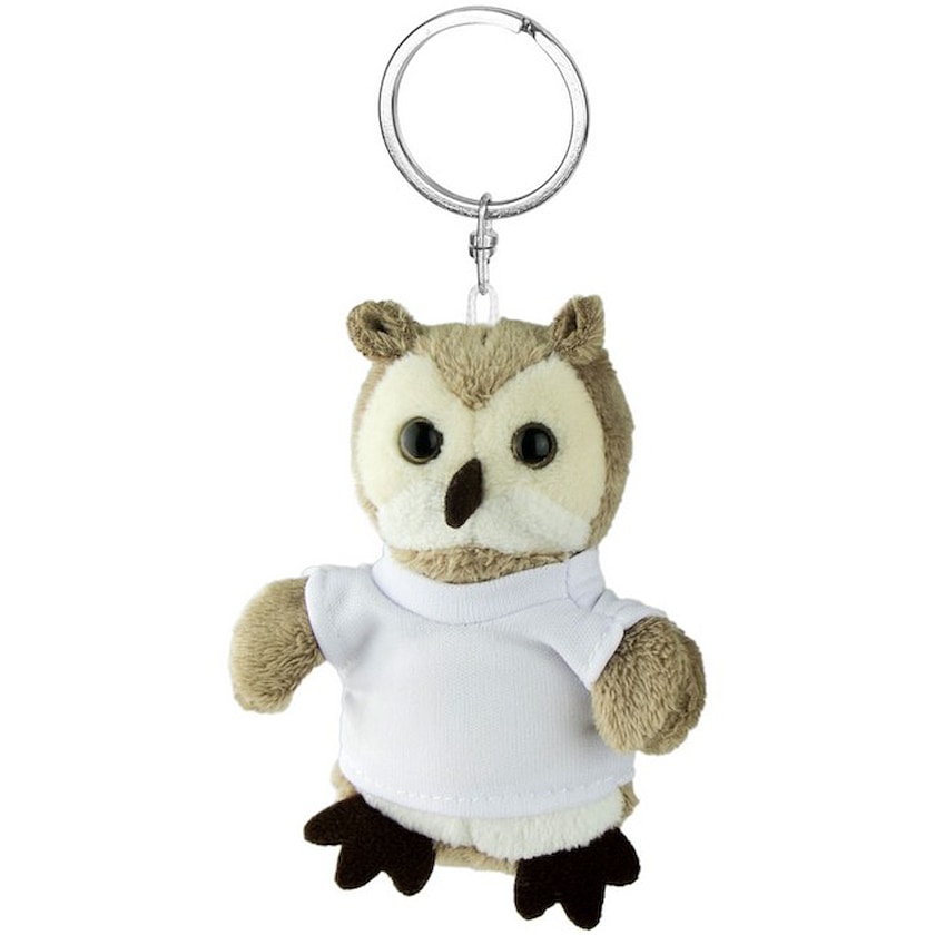 En klok uggla med nyckelring. Trycket sker på ugglans t-shirt.
