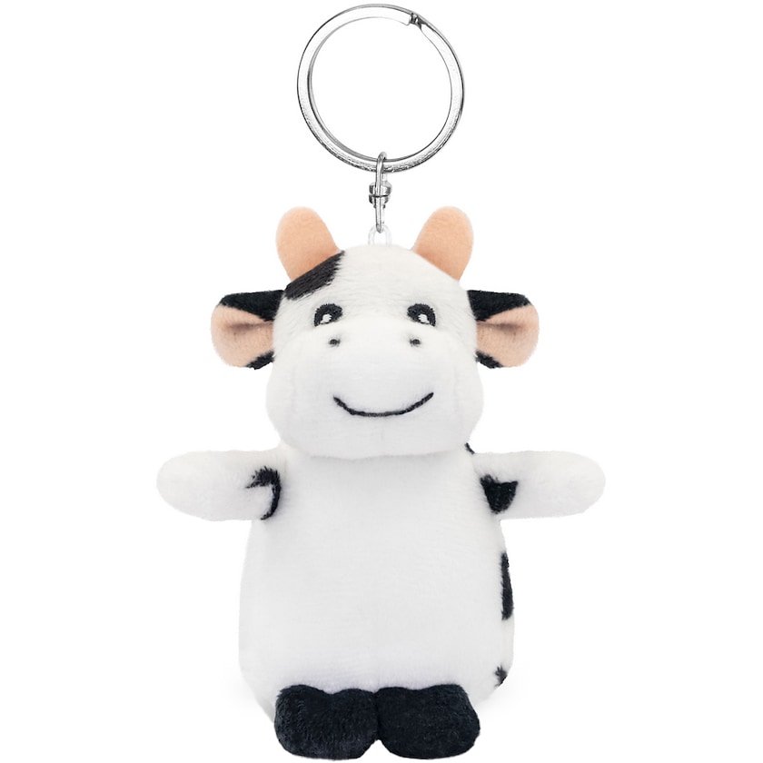 En glad och kramgo ko med nyckelring. Trycket görs på magen.