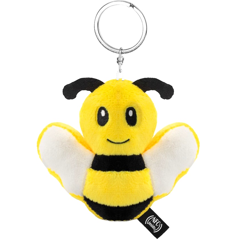 Ett vänligt bi med nyckelring. Sting är tillverkad av återvunna PET-flaskor (rPET). Etiketten är försedd med ett NFC-chip som kan kommunicera med mobila enheter med hjälp av NFC-teknologi. T ex kan en länk till en webbsida kommuniceras från NFC-chippet till en mobiltelefon.
