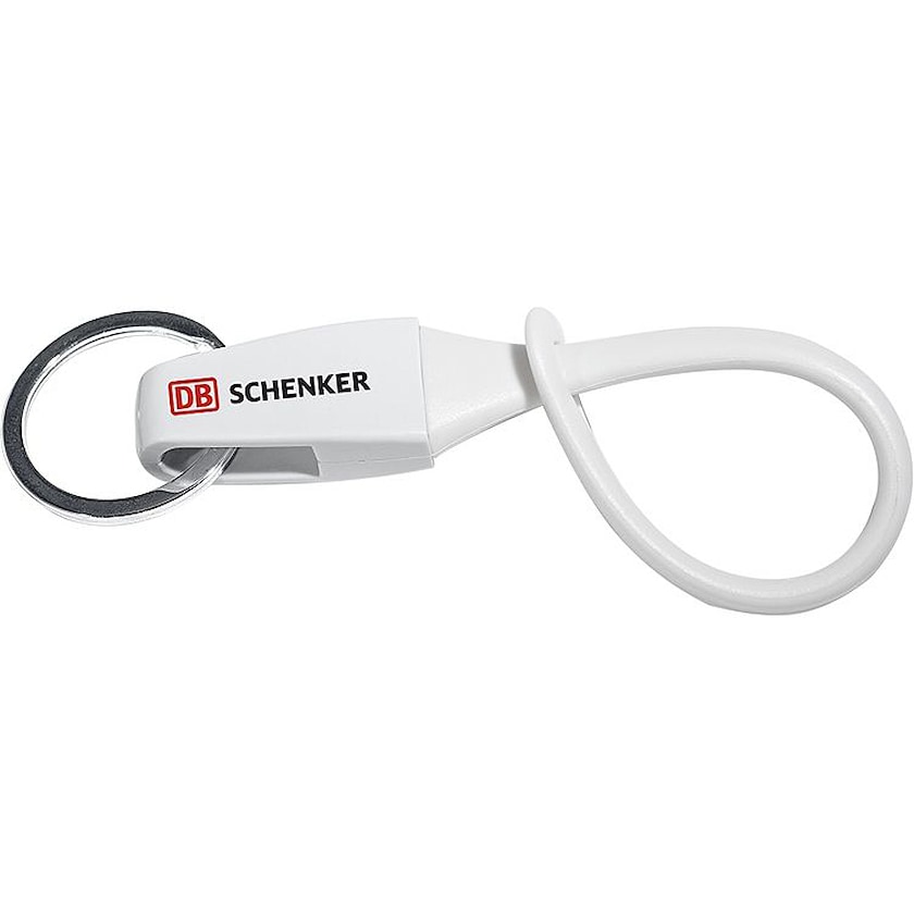 Nyckelring med handledsrem av silikon. Trycket sker på nyckelringens plastdel.