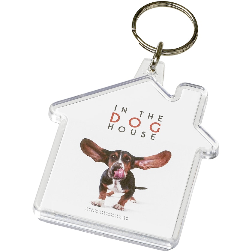 Miljövänlig husformad nyckelring med eget tryck. Madden är tillverkad av det miljövänliga materialet GPPS. Trycket sker på båda sidor av ett papper som placeras innanför nyckelringens GPPS-plasthölje. Trycket kan vara olika på de båda sidorna. Nyckelringen är tillverkad i Europa.