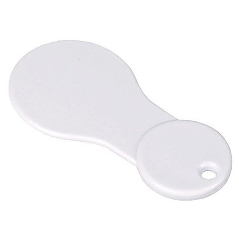 Kundvagnsmynt i vit solid plast med både fem- och tiokrona.